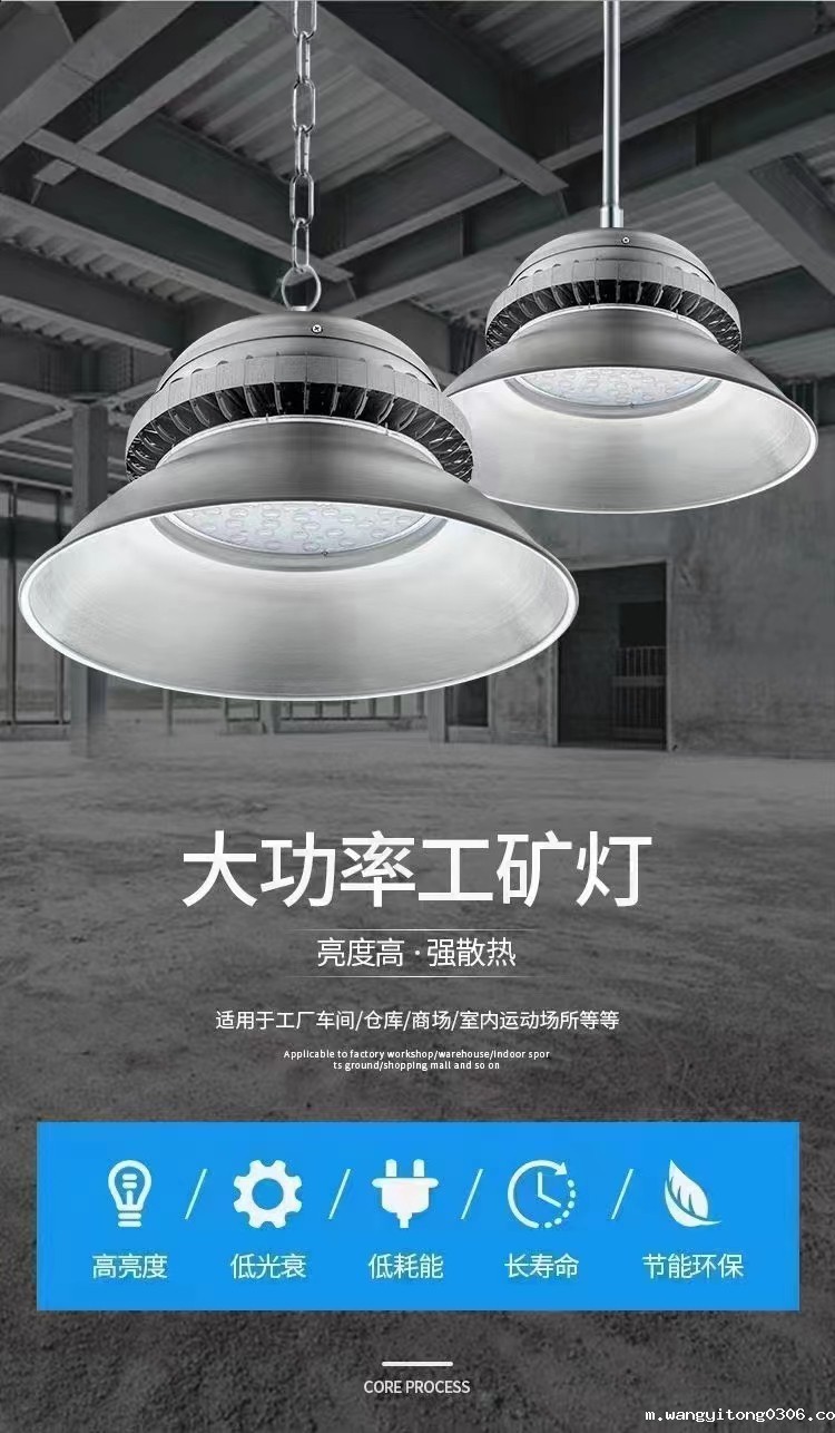 工矿灯,又称高天棚灯,是一种高能效的室内 LED 灯具,可以广泛应用在工业厂房、生产车间、商超、体育娱乐场所以及仓库等。按照明功能可分为一般照明灯和局部照明灯两种。为了满足不同生产作业的视觉需要和灯具安装条件的需要,工矿灯的反射器应能产生各种宽窄程度的光分布。表面涂漆、涂釉使之呈现白色,和用铝、玻璃镜、棱镜玻璃等材料制成的反射器,都可以得到宽的光分布,适合于大面积、工作面垂直或接近垂直的工作场所。对于高大厂房和有高大机床的需要单独照明的场所,可采用棱镜玻璃、镜面玻璃和抛光铝等控光性能强的材料制成的反射器,得到窄光束分布。